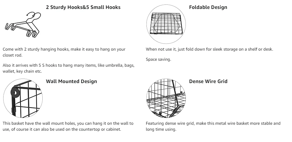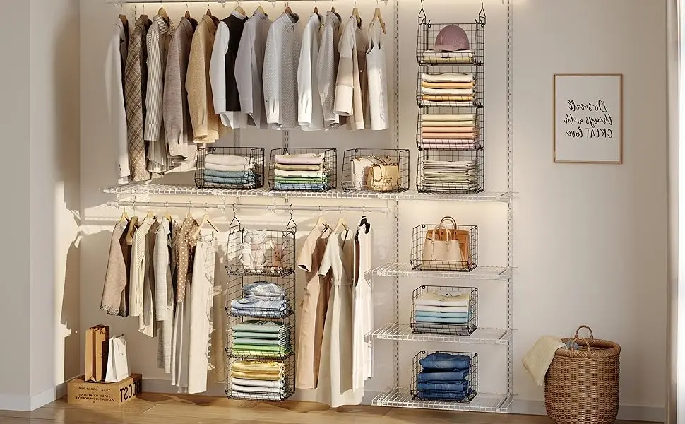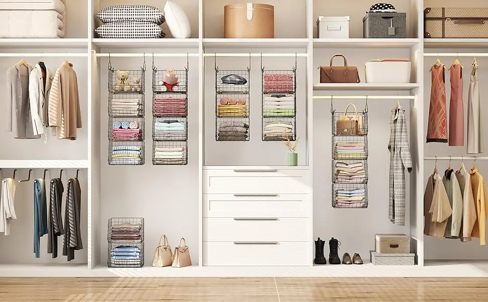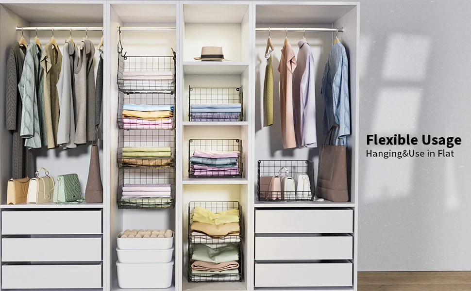 Featuring 2 sturdy metal hooks, this closet hanging baskets is easy to hang on the closet bar.