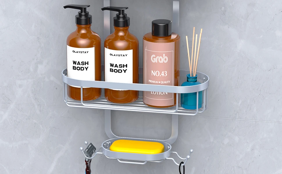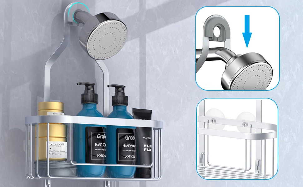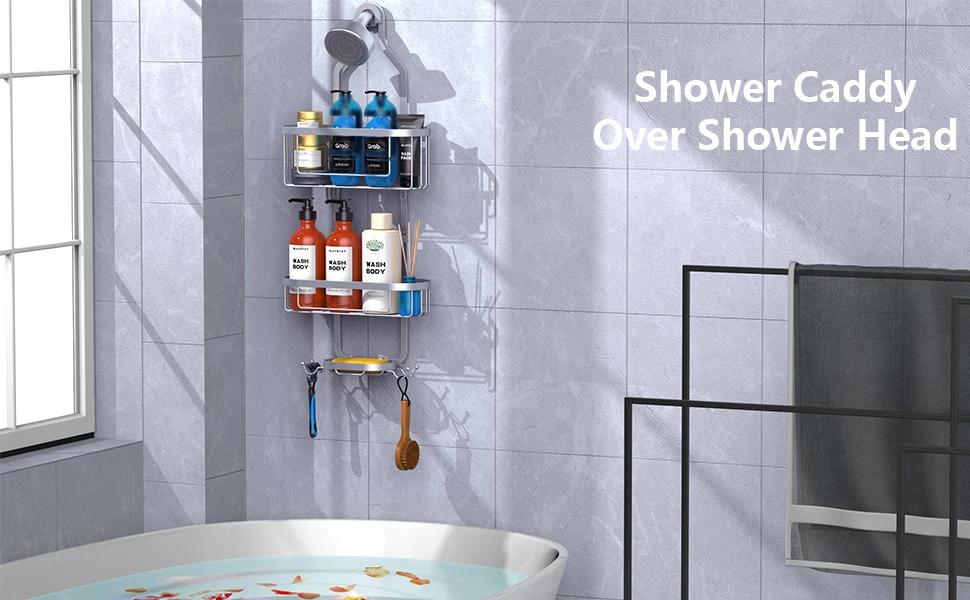 You are here: Home » Products » Bathroom Storage » Modern Double-Tier Steel Shower Organizer Hanging Bathroom Storage Rack with Hooks for Sundries Overhead Shower Caddy